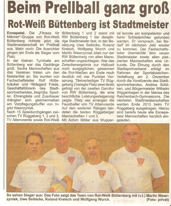Die "Fitness für Männer - Gruppe" von Rot-Weiss Büttenberg richtete in diesem Jahr die Stadtmeisterschaft 2012 im Prellball aus. Die kleine Turnhalle am Büttenberg wurde hergerichtet und Ingrid Wawrzyniak stellte ein vielfältiges Verpflegungsangebot zusammen, dass gern genutzt wurde.