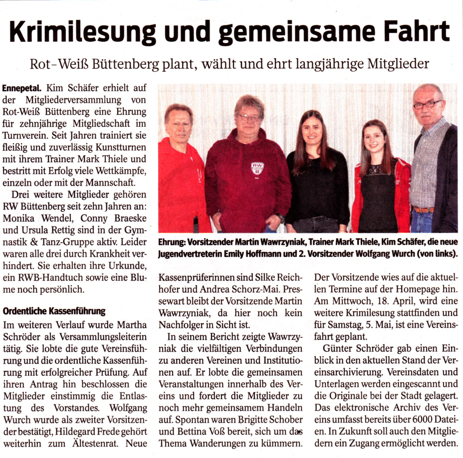 Kim Schäfer erhielt auf der Mitgliederversammlung von RWB eine Vereinsehrung für zehnjährige Mitgliedschaft im Turnverein Rot-Weiss Büttenberg.