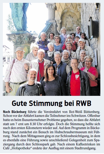 Mit leichtgetrübter Stimmung, bei nicht gerade zum Schwitzen verleitenden Temperaturen, warteten wir um 7.00 Uhr an der Büttenberger Schule auf den Bus, der uns nach Bückeburg fahren sollte. Was war passiert? Beim Busunternehmer gab es anscheinend Probleme, die darauf hinausliefen, dass wir erst um 8.30Uhr loskamen. Die Stimmung hellte sich nach den ersten Kilometern wieder auf und so kamen wir, natürlich verspätet aber wohlbehalten, in Bückeburg an.