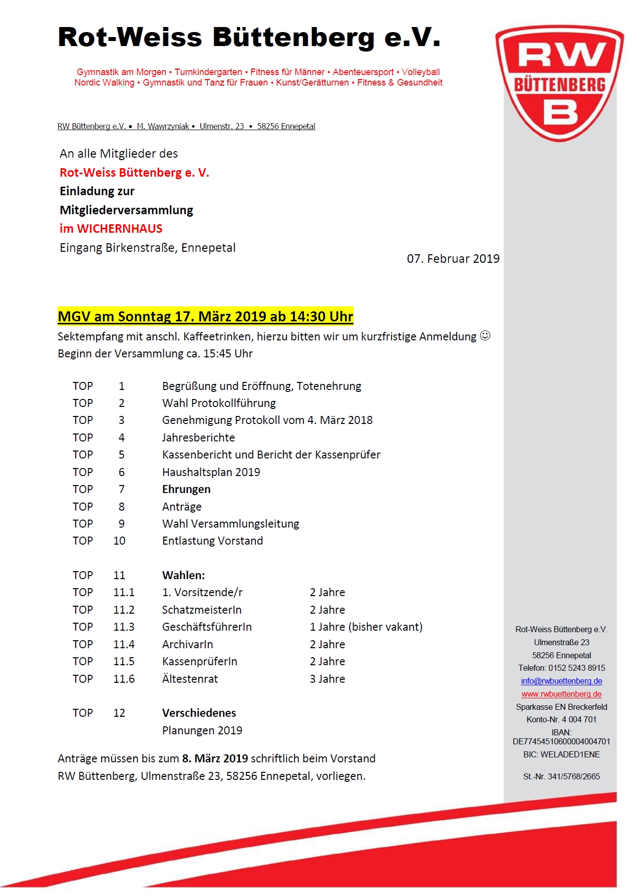 Zur Mitgliederversammlung von Rot-Weiss Büttenberg e. V. am Sonntag 17. März 2019 um 14:30 Uhr lädt der Vorstand seine Mitglieder ein. Zu Beginn gibt es einen lockeren Informationsaustausch bei Kaffee und Kuchen. Hierzu wird um eine Rückmeldung für die Vorbereitungen gebeten. Die offizielle Mitgliederversammlung beginnt etwa eine Stunde später um 15:45 Uhr. Ort der Veranstaltung ist das Wichernhaus am Büttenberg in der Birkenstraße. Nach den Jahresberichten stehen auch Ehrungen für langjährige Mitgliedschaft auf der Tagesordnung. In diesem Jahr sind Ehrungen für 10, 25 und 40 Jahre Mitgliedschaft vertreten. Zur Wahl stehen die Positionen erster Vorsitzender, Schatzmeister und Archivar bei den Senioren. Wie in jedem Jahr werden noch ein Kassenprüfer und ein Mitglied des Ältestenrates gewählt. Termine und Veranstaltungen für das laufende Jahr werden vorgestellt. Wahlberechtigt sind alle volljährigen Mitglieder des Vereins.