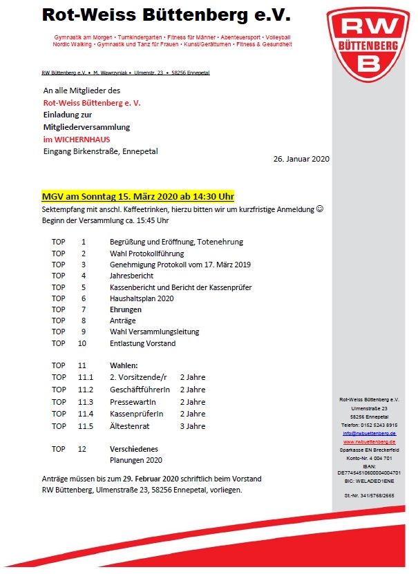 Zur Mitgliederversammlung von Rot-Weiss Büttenberg e. V. am Sonntag 15. März 2020 um 14:30 Uhr lädt der Vorstand