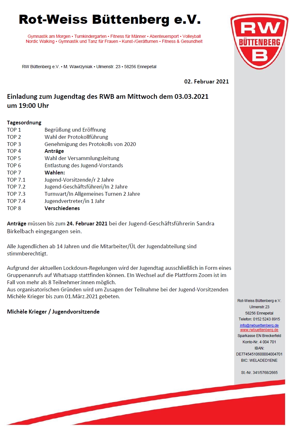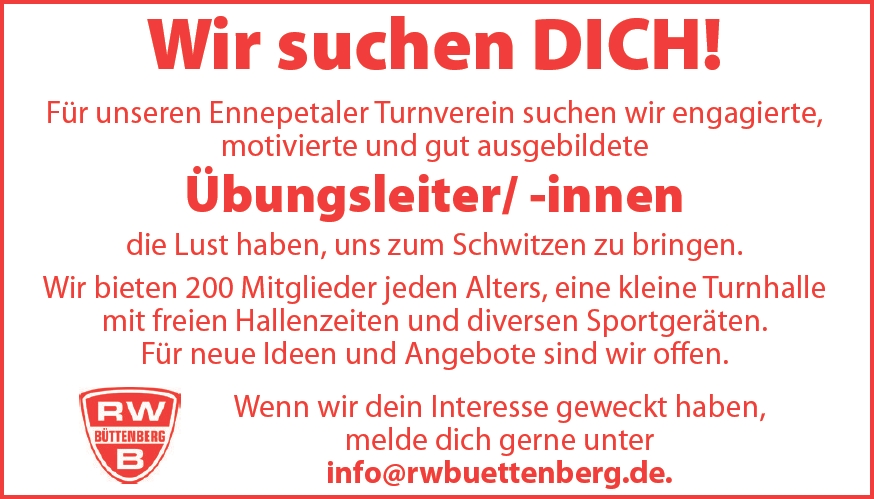 Mail unter info@rwbuettenberg.de mit eurem Namen, der Handynummer und eurer Adresse, an der ihr anzutreffen seid während der Sporteinheit, damit