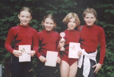 Mit gutem Erfolg beendete die Nachwuchs-Kunstturnriege des Rot-Weiss Büttenberg die Gauliga-Saison. Ungefährdet behaupteten sich die Mädchen vom Büttenberg mit einem dritten Rang in der Gauliga II. Die Kunstturnerinnen vom RW Büttenberg mit Pokal für den 3. Platz in der Gauliga II In der Mendener Kreissporthalle gaben die vier Kunstturnerinnen vom RWB ein Debüt neuer Übungselemente, die durch Trainingsfleiß in den vergangenen Wochen erlernt wurden. Auf Anhieb gelangen den beiden Neunjährigen Laura Reinke und Mona Morgenstern am Boden zum ersten Mal ein Flick Flack. Dadurch erkämpfte sich die Mannschaft mit 22,50 Zählern am Boden die meisten Punkte der vier Geräte. Am Pferdsprung gelang den Mädchen ein Handstandüberschlag. Cecilia Guthof, mit dreizehn Jahren die Älteste im Team, wurde vom Kampfgericht mit drei Achterwertungen für ihre guten Leistungen belohnt. |