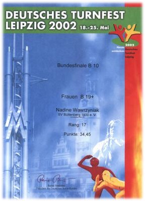 Am 18. bis 25. Mai 2002 fuhren wir neun Turnerinnen mit unseren beiden Trainern zum Deutschen Turnfest nach Leipzig. Als Unterkunft diente das Klassenzimmer einer Berufsschule. Der Auftakt zum 31. Turnfest war wie immer ein Festzug aller Turnerbunde durch die Innenstadt. Am Wochenende blieb noch Zeit, Leipzig und Umgebung etwas kennenzulernen. Wir besuchten die Nikolaikirche und gingen durch die Altstadt. Beim Abendessen in einem Restaurant, was übrigens mit elf Personen nicht immer ganz leicht war, trafen wir unsere befreundeten Turnerinnen aus Schalksmühle. Die Abende ließen wir mit Gesellschaftsspielen und Singen zur Gitarre ausklingen. Etwas später wurde es am zweiten Abend, da wir noch Nadines Geburtstag feiern mussten. Der Hausmeister war sehr nett und zeigte Verständnis. Ab Montag begann die Teilnahme an den Wettkämpfen. Beim DTB-Wahlwettkampf landeten Linda Venzke und Nadine Wawrzyniak mit den Plätzen 12 und 15 in der Nähe der Podestplätze. Bei einer Konkurrenz von 236 Teilnehmerinnen schon beachtlich, aber auch die anderen Büttenbergerinnen kämpften tapfer um die Plätze, siehe unten die Ergebnisse. Auch die Trainer mussten ihr Können unter Beweis stellen. Mark Thiele belegte Platz 207 und Fabio Gianfelici wurde 242.